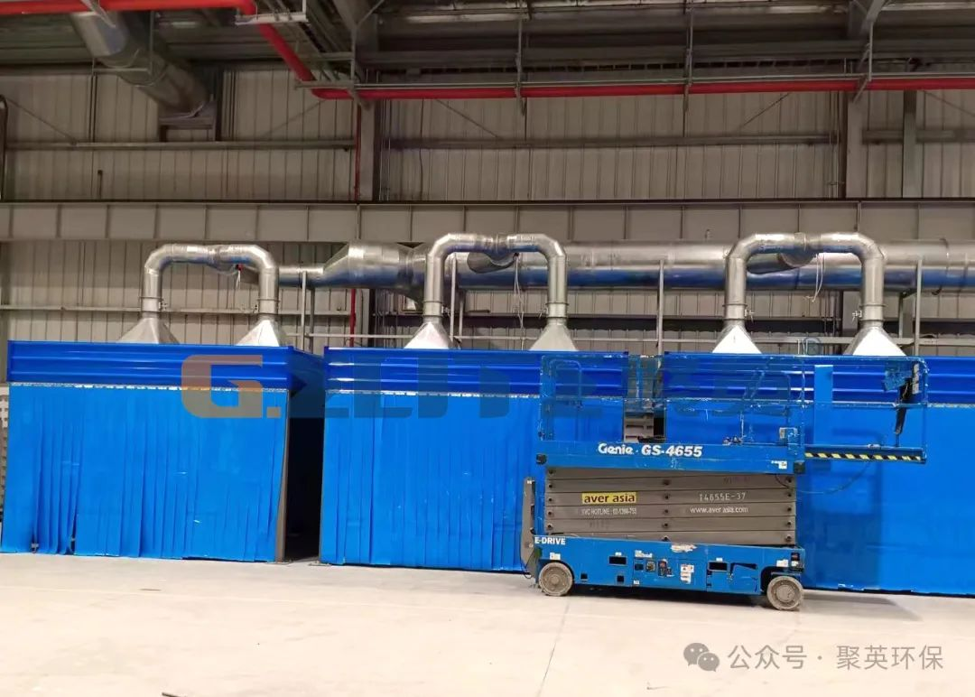 焊接點 →半封閉房體 → 吸風管路 →濾筒式焊煙凈化器 → 風機 → 煙囪(室外鋼平臺支撐)