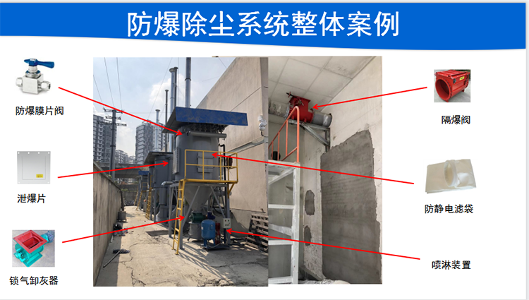 對整個除塵器箱體進行加固。鋼板的厚度多少、能承受多少的壓力等,在進風口加裝單向閥或隔爆閥,當爆炸發生時,不會影響到其他管道。在除塵器箱體上加裝泄爆口或泄爆片。泄爆片的作用是在爆炸發生時,將爆炸的能量泄向一個可控的,且不受影響的地方。