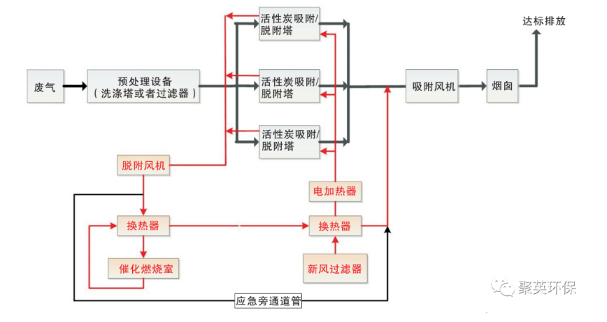 由環保離心風機將大風量、低濃度有機廢氣吸入活性炭吸附床,在吸附床內與多層蜂窩狀活性炭充分凈化(吸附),活性炭內部逐漸富集濃縮大量有機廢物,而潔凈的氣體則排入大氣;通過燃燒裝置產生的高溫氣體經換熱之后通入活性炭吸附床,使內部有機廢物90℃高溫氣化從活性炭孔隙中逸散而出,此時的廢氣濃度遠遠高于初始吸附的廢氣濃度,然后進入催化燃燒裝置(350℃)進行氧化分解成CO2和H2O等無害氣體,氣體經由熱交換器將熱量傳遞再次用于脫附,最后排入大氣,以此完成一整套凈化流程。